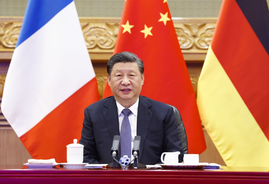 3月8日下午,國家主席習(xí)近平在北京同法國總統(tǒng)馬克龍、德國總理朔爾茨舉行視頻峰會。新華社記者 李響 攝