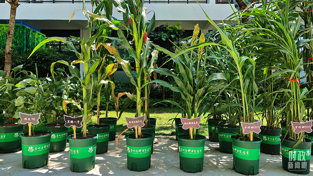 △種子實(shí)驗(yàn)室展示黑糯一號(hào)玉米(左二)、矮化釀酒高粱(左四)等。(總臺(tái)央視記者楊立峰拍攝)