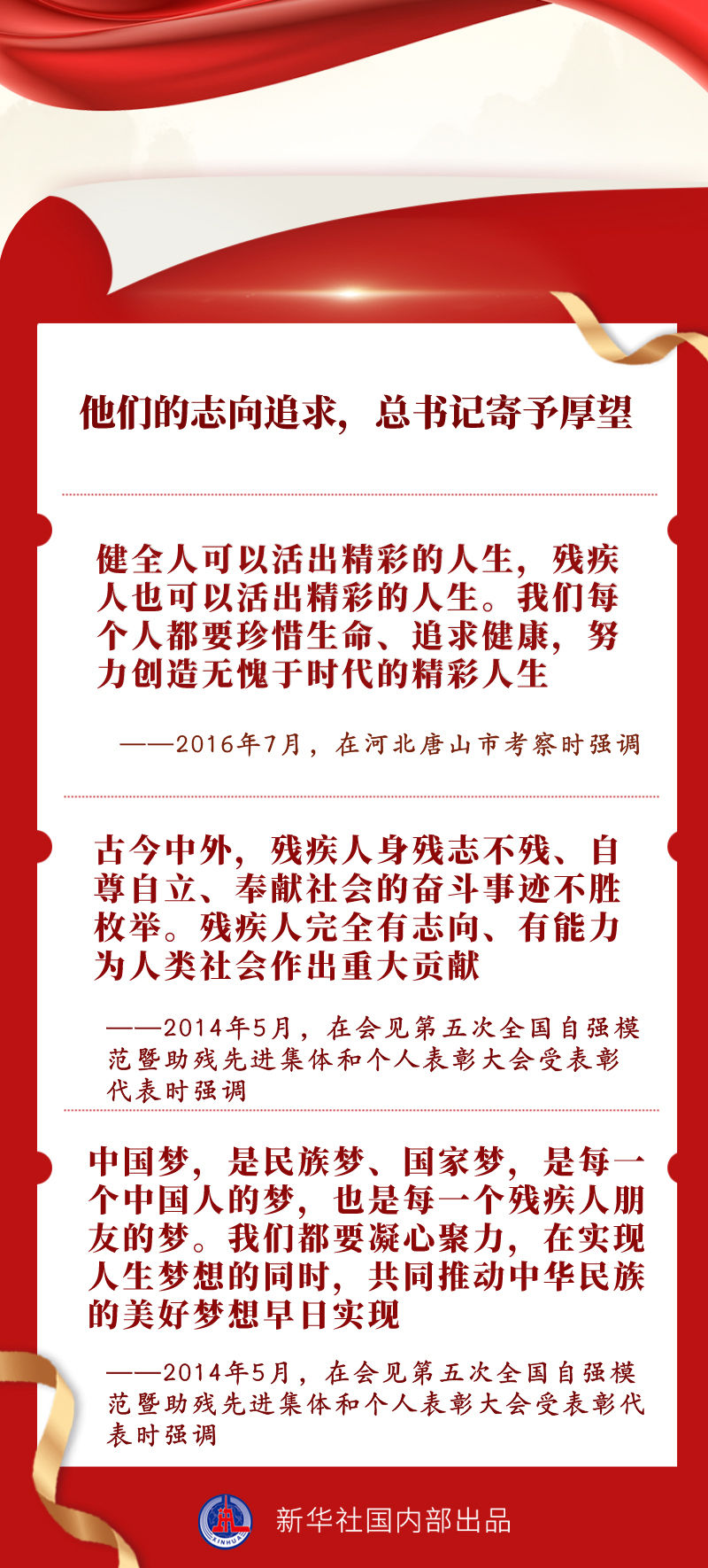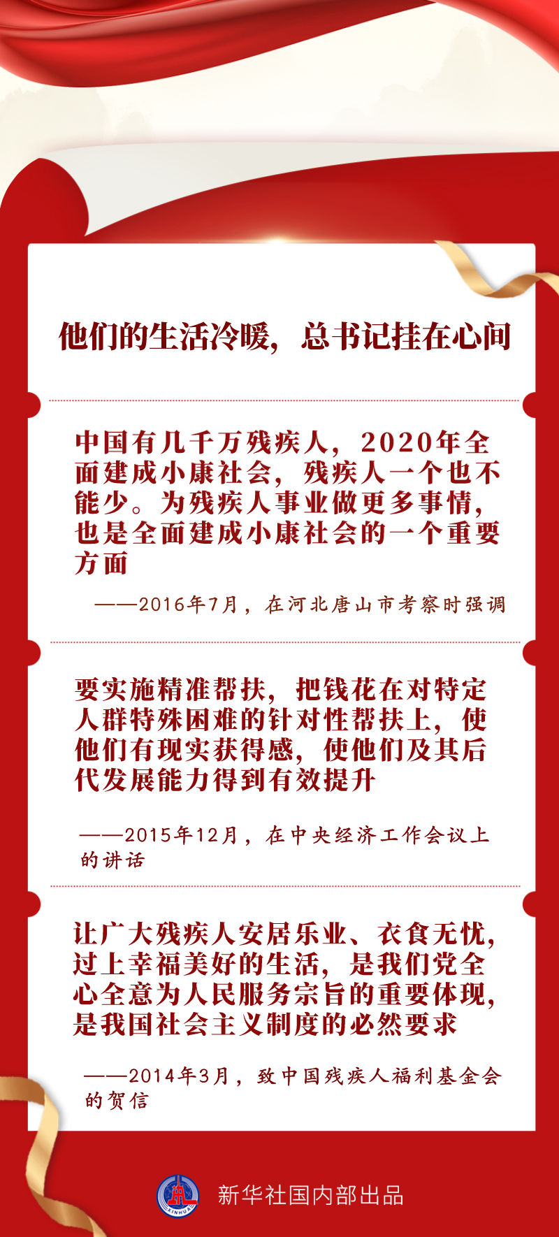 我國有8500萬殘疾人,是特殊困難的群體。黨的十八大以來,習(xí)近平總書記對殘疾人“格外關(guān)心、格外關(guān)注”,圍繞保障殘疾人基本民生、改善殘疾人生活品質(zhì)、促進(jìn)殘疾人全面發(fā)展等方面多次發(fā)表重要講話、作出重要指示。5月15日,在第三十二次全國助殘日到來之際,讓我們一同感悟總書記心中這份“格外”的愛。