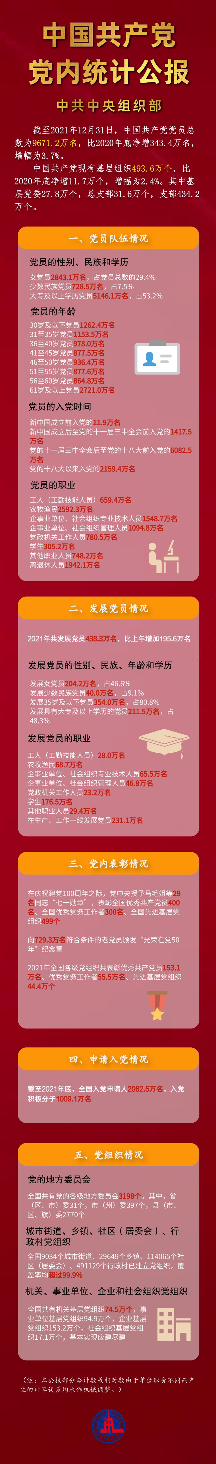 截至2021年12月31日,中國共產(chǎn)黨黨員總數(shù)為9671.2萬名,比2020年底凈增343.4萬名,增幅為3.7%。