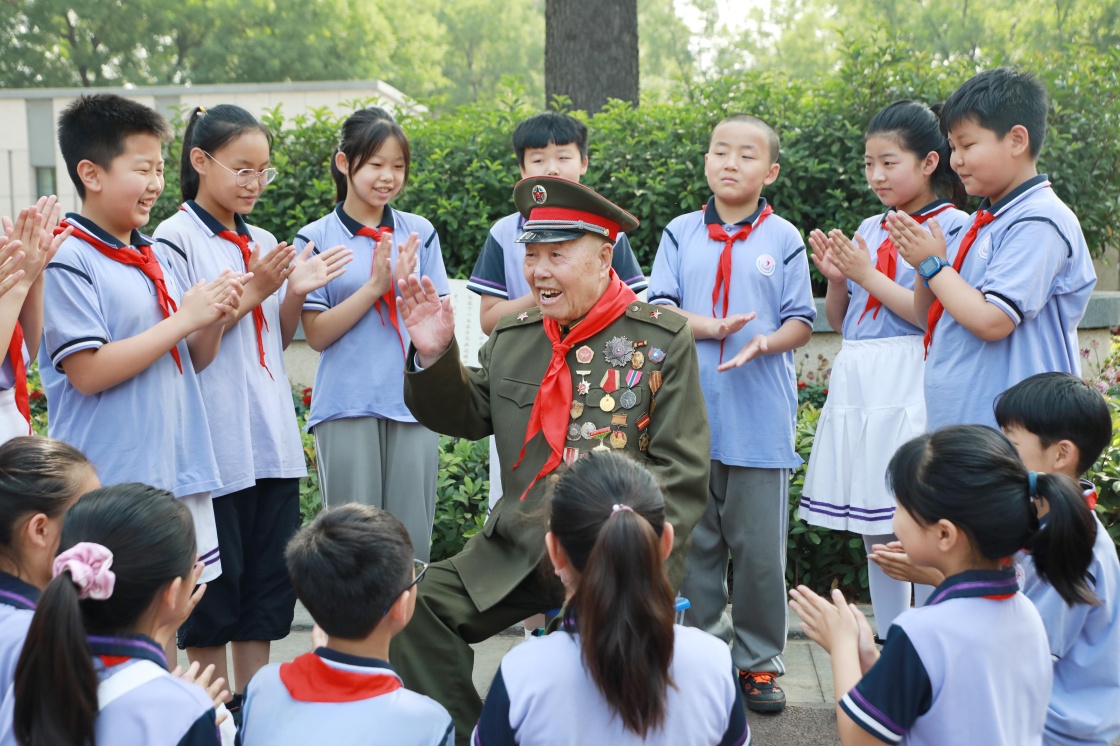 王占山(中)給河南省安陽市三官廟小學(xué)的少先隊(duì)員們講戰(zhàn)斗故事(2021年6月11日攝)。新華社發(fā)(戴丹華 攝)