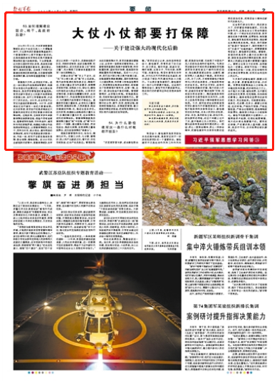2016年9月13日,中央軍委聯(lián)勤保障部隊成立大會在北京八一大樓隆重舉行,習主席向武漢聯(lián)勤保障基地和5個聯(lián)勤保障中心授予軍旗并致訓詞。這是構建具有我軍特色的現(xiàn)代聯(lián)勤保障體制的重大戰(zhàn)略舉措。習主席強調(diào),這次深化國防和軍隊改革,具體到后勤領域就是要重塑后勤體系,建設聯(lián)合、精干、高效的后勤。這體現(xiàn)了對現(xiàn)代后勤建設規(guī)律的深刻把握,為后勤領域聚焦保障打贏、加快轉(zhuǎn)型重塑明確了目標引領。