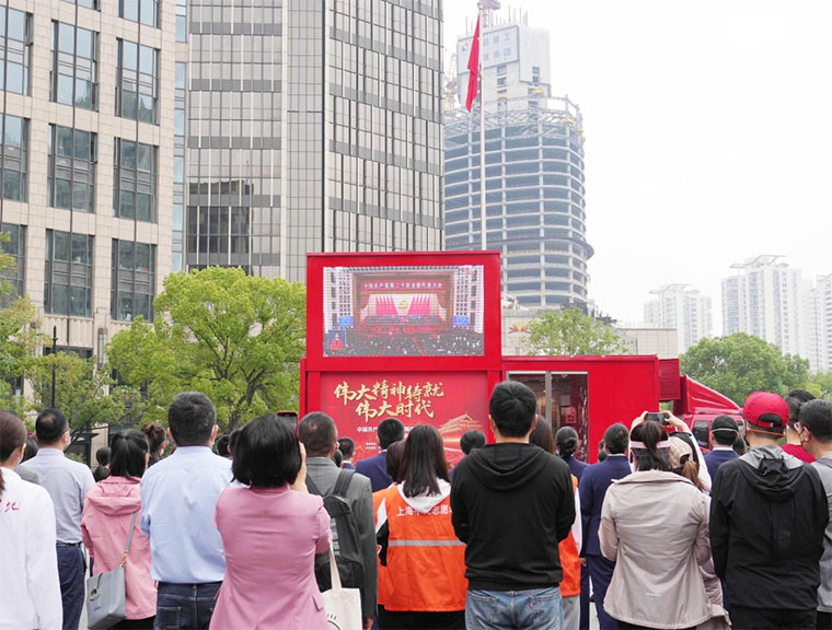 △ 10月16日,在上海中共一大紀(jì)念館前,工作人員、志愿者和觀眾在收看中國共產(chǎn)黨第二十次全國代表大會開幕會?!⌒氯A社記者 劉穎 攝