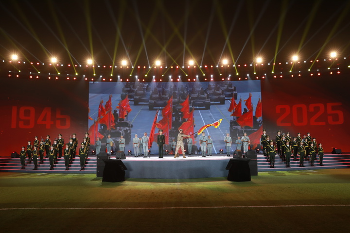 當(dāng)戰(zhàn)旗展開的那一刻,王宸一鄭重囑托:“你們要將這戰(zhàn)旗攥得更緊,舉得更高!戰(zhàn)旗所指,就是前進方向。”他對著在場的師生高聲發(fā)問:“想想民族屈辱,想想抗戰(zhàn)先輩,革命先烈的精神,你們忘沒忘?”臺下齊聲回應(yīng):“沒忘!沒忘!永不忘!”