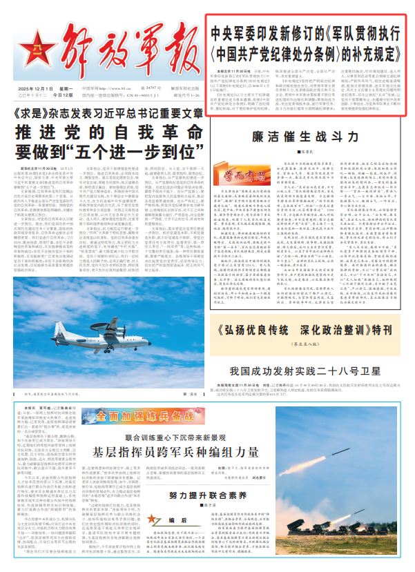 解放軍報(bào)北京11月30日電 日前,中央軍委印發(fā)新修訂的《軍隊(duì)貫徹執(zhí)行〈中國(guó)共產(chǎn)黨紀(jì)律處分條例〉的補(bǔ)充規(guī)定》(以下簡(jiǎn)稱(chēng)《補(bǔ)充規(guī)定》),自2026年1月1日起施行。