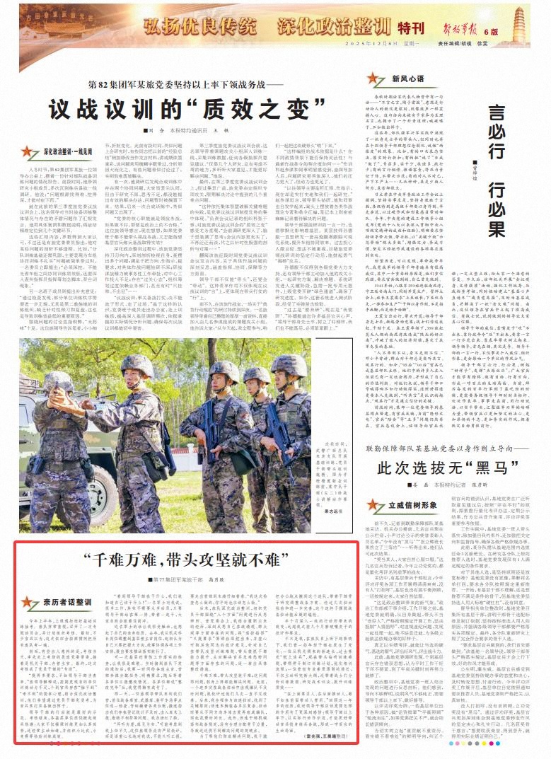 不只是我,在旅隊(duì)自上而下的影響下,我們營一些年輕干部也發(fā)生了變化:一位從機(jī)關(guān)調(diào)來的新連長,過去喜歡“紙上談兵”,現(xiàn)在帶頭鉆研訓(xùn)練難題,帶領(lǐng)骨干制訂訓(xùn)練計(jì)劃,優(yōu)化組訓(xùn)流程;一位曾經(jīng)專業(yè)素質(zhì)薄弱的排長,不僅主動(dòng)研究新大綱,還帶著戰(zhàn)士們分析訓(xùn)練數(shù)據(jù)、研究戰(zhàn)術(shù)訓(xùn)法,提升訓(xùn)練質(zhì)效……