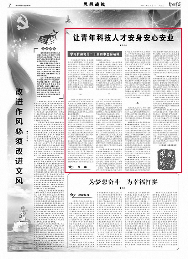 科學(xué)的未來在于青年。青年興則國興,青年強(qiáng)則國強(qiáng)。習(xí)主席高度重視青年科技人才隊(duì)伍建設(shè),強(qiáng)調(diào)“要把培育國家戰(zhàn)略人才力量的政策重心放在青年科技人才上”“要重視解決青年科技人才面臨的實(shí)際困難,讓青年科技人才安身、安心、安業(yè)”。黨的二十屆四中全會(huì)提出:“營造具有全球競(jìng)爭力的開放創(chuàng)新生態(tài)。支持青年科技人才創(chuàng)新創(chuàng)業(yè)。”新時(shí)代新征程,必須充分激發(fā)青年科技人才創(chuàng)新創(chuàng)造活力,用心用情用力為生力軍鼓勁加油,讓千里馬縱橫馳騁,為以中國式現(xiàn)代化全面推進(jìn)強(qiáng)國建設(shè)、民族復(fù)興偉業(yè)提供有力科技人才支撐。