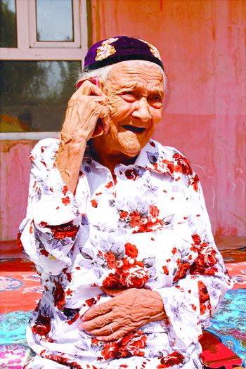 見(jiàn)客人來(lái)了,阿麗米罕的養(yǎng)女塔吉古圖扶著母親走了出來(lái)。由于患有腿疾,再加上年事已高,老人走起路來(lái)有點(diǎn)喘。別看老人已經(jīng)128歲,打扮得卻像小姑娘一樣俊俏。她頭戴一塊繡花頭巾,身穿一條白底紅花的連衣裙,腳上穿著一雙蝴蝶結(jié)裝飾的黑色小皮鞋,時(shí)髦靚麗??次覀兡贸鱿鄼C(jī),老人問(wèn):“我的頭巾好看嗎?用不用摘掉?”惹得大家伙一陣歡笑。隨后,老人摘下頭巾,露出深紫色的小帽子,頭發(fā)雖然稀少,卻被精致地編起來(lái)。老人不時(shí)擺弄小辮子,擺不同的姿勢(shì)讓大家為她多拍些漂亮照片,活脫一個(gè)愛(ài)美的“老小孩”。