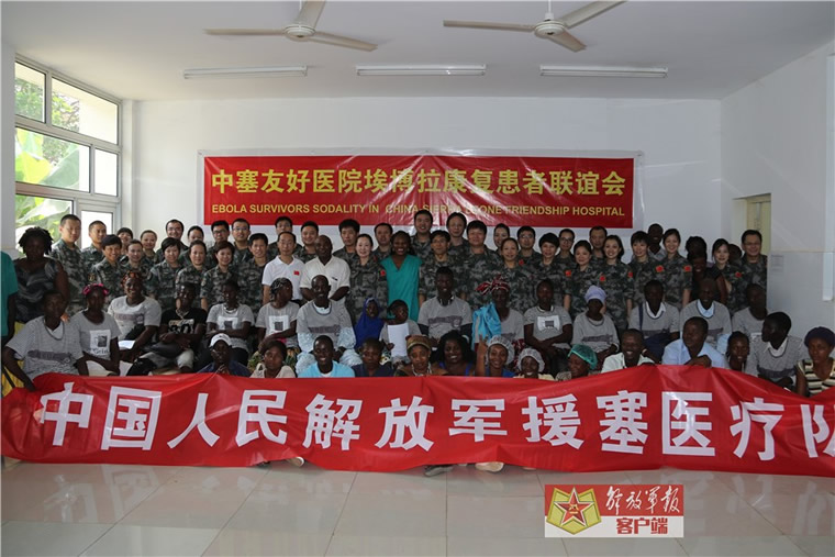 上圖:中塞醫(yī)務(wù)人員與19位埃博拉康復(fù)患者合影。