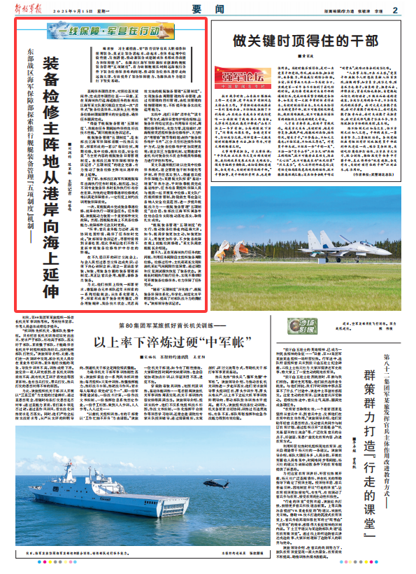 編者按 習(xí)主席指出,要“教育引導(dǎo)官兵大膽操作和使用裝備,真正讓裝備活起來(lái)、動(dòng)起來(lái),在體系運(yùn)用中檢驗(yàn)性能、發(fā)掘潛能,推動(dòng)新裝備成建制成體系形成作戰(zhàn)能力和保障能力”。東部戰(zhàn)區(qū)海軍保障部探索創(chuàng)新的艦艇裝備管理“五項(xiàng)制度”,著力破解艦艇長(zhǎng)時(shí)間遠(yuǎn)海航行條件下裝備檢修保養(yǎng)難的問(wèn)題,推動(dòng)裝備檢修從港岸走向遠(yuǎn)海大洋,有效提升了裝備保障能力,為部隊(duì)?wèi)?zhàn)斗力建設(shè)打下堅(jiān)實(shí)基礎(chǔ)。