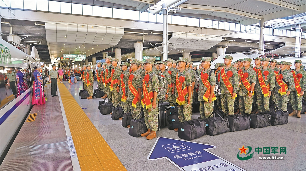 與此同時,千里之外的廣州南站人頭攢動。在鐵路工作人員陳慧專的引導(dǎo)下,400多名新兵有序登上開往北京的G82次“強軍號”國防主題列車。