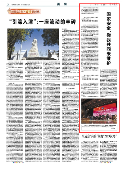 在第四個(gè)全民國(guó)家安全教育日到來之際,大江南北,軍營(yíng)內(nèi)外,通過講座、展覽、演出等形式,開展各類主題宣傳教育活動(dòng),傳播國(guó)家安全知識(shí),提高全民自覺維護(hù)國(guó)家安全的意識(shí)和實(shí)效。請(qǐng)關(guān)注今日《解放軍報(bào)》的報(bào)道——