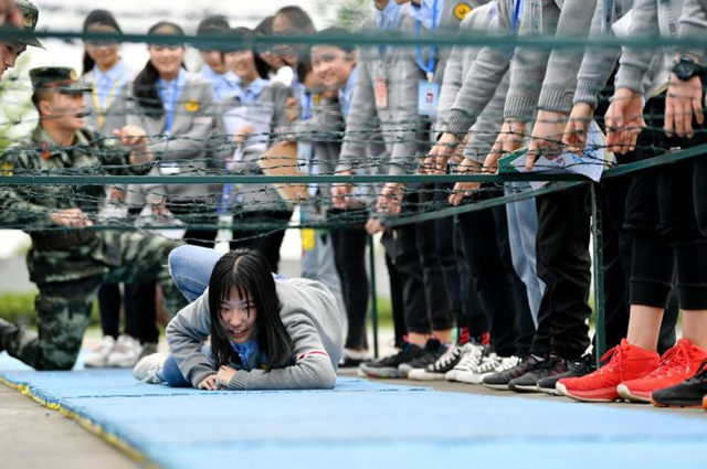 圖為重慶市青木關中學師生在武警重慶總隊執(zhí)勤第二支隊沙坪壩區(qū)中隊營區(qū)觀看刺殺演示 新華社發(fā)(曹峰攝)