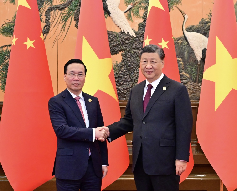 10月20日上午,國(guó)家主席習(xí)近平在北京人民大會(huì)堂會(huì)見(jiàn)來(lái)華出席第三屆“一帶一路”國(guó)際合作高峰論壇的越南國(guó)家主席武文賞。新華社記者 翟健嵐 攝