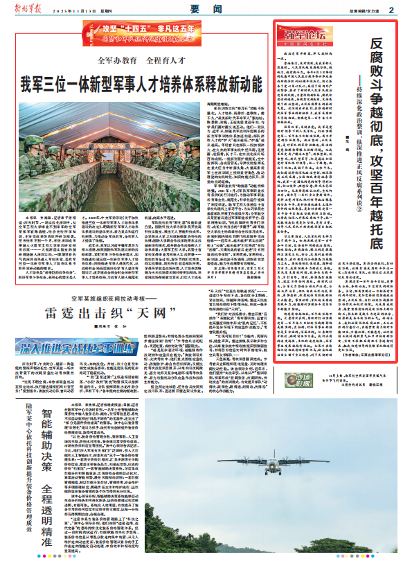 崇尚廉潔、反對(duì)腐敗,是我軍的天然屬性。人民軍隊(duì)越反腐越堅(jiān)強(qiáng)、越純潔、越有戰(zhàn)斗力。今年9月3日舉行的紀(jì)念中國人民抗日戰(zhàn)爭暨世界反法西斯戰(zhàn)爭勝利80周年閱兵式,極大振奮了黨心軍心民心,贏得了國內(nèi)外廣泛贊譽(yù),展示了新時(shí)代人民軍隊(duì)政治建軍新風(fēng)貌、力量結(jié)構(gòu)新布局、現(xiàn)代化建設(shè)新進(jìn)展、備戰(zhàn)打仗新成效,充分展現(xiàn)了政治整訓(xùn)、正風(fēng)反腐帶來的嶄新氣象。這深刻啟示我們,在推進(jìn)新時(shí)代強(qiáng)軍事業(yè)的新征程上,我軍反腐敗斗爭越徹底,實(shí)現(xiàn)建軍一百年奮斗目標(biāo)越托底。