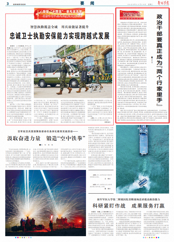 強(qiáng)化“兩個行家里手”意識,提高領(lǐng)兵打仗、決戰(zhàn)決勝的本領(lǐng)。習(xí)主席指出,政治干部要努力學(xué)軍事、學(xué)指揮、學(xué)科技,全面提高綜合素質(zhì)和實(shí)際能力,政治工作要成為行家里手,軍事工作也要成為行家里手,這樣才能把政治工作做好。政治干部不能做訓(xùn)練的“旁觀者”、打仗的“門外漢”,而應(yīng)下功夫把練兵打仗、指揮打仗、帶兵打仗的本領(lǐng)搞過硬,具備“坐下來能寫、站起來能講、上戰(zhàn)場能打”的素質(zhì),真正成為政治工作和軍事工作“兩個行家里手”。
