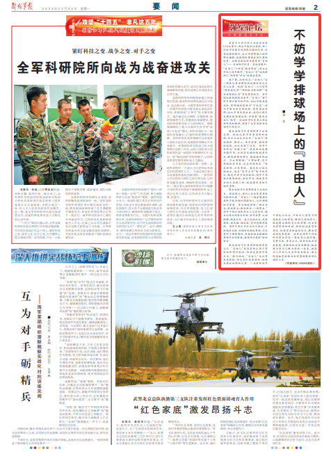 據(jù)了解,20世紀(jì)末,“自由人”這一特殊位置由國(guó)際排球聯(lián)合會(huì)正式引入比賽。說(shuō)起“自由人”,人們常用“特別能吃苦”“預(yù)判能力特別強(qiáng)”“基本功特別扎實(shí)”等來(lái)贊譽(yù)他們。在中國(guó)女排的輝煌歷史中,“自由人”留下許多難以磨滅的印記:2004年雅典奧運(yùn)會(huì),張娜被球迷稱為“不死鳥(niǎo)”,助力中國(guó)女排實(shí)現(xiàn)逆轉(zhuǎn),勇奪奧運(yùn)金牌;2016年里約奧運(yùn)會(huì),林莉以穩(wěn)定發(fā)揮筑起堅(jiān)固后防,并榮獲“最佳自由人”稱號(hào)。自由防守隊(duì)員身上的這種作風(fēng)和精神,值得廣大官兵特別是領(lǐng)導(dǎo)干部學(xué)習(xí)。