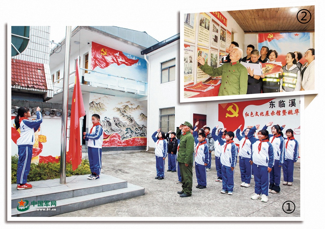 圖①:11月24日,姚華亮應(yīng)邀為安徽省休寧縣汊口中心小學(xué)學(xué)生上國(guó)防教育課,并與學(xué)生一起到東臨溪鎮(zhèn)紅色文化展示館參加升旗儀式。武時(shí)化 攝