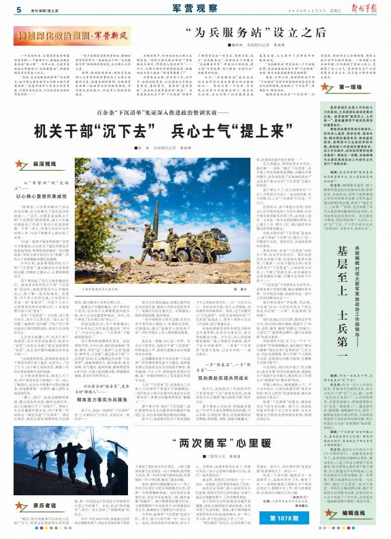 基層是一面鏡,兵心是一桿秤。官兵認(rèn)可的背后,是機(jī)關(guān)干部“下沉營連”聽取基層心聲、真情實意解決官兵難題的務(wù)實舉措。