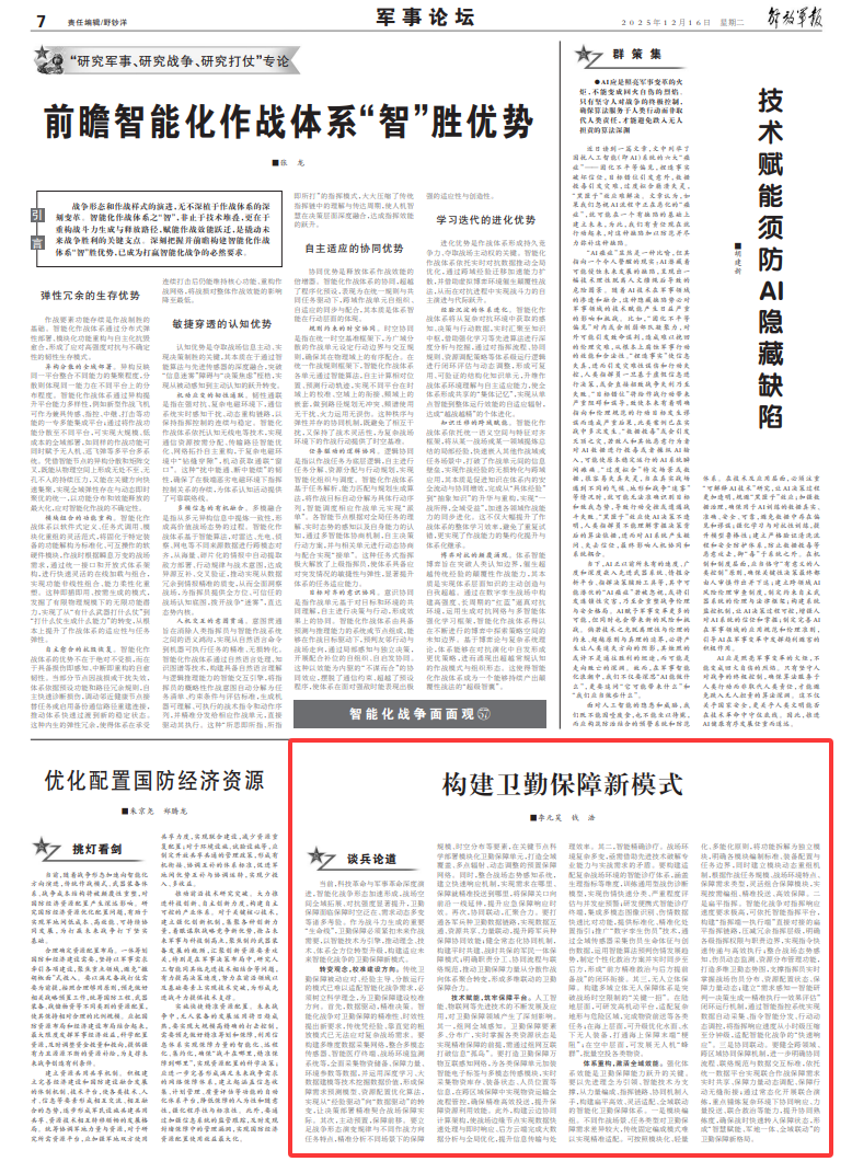 轉(zhuǎn)變觀念,校準建設(shè)方向。傳統(tǒng)衛(wèi)勤保障被動應(yīng)對、經(jīng)驗主導(dǎo)、分散運行的模式已難以適配智能化戰(zhàn)爭需求,必須樹立科學(xué)理念,為衛(wèi)勤保障建設(shè)校準方向。首先,數(shù)據(jù)驅(qū)動,精準決策。智能化戰(zhàn)爭對衛(wèi)勤保障的精準性、時效性提出新要求,傳統(tǒng)憑經(jīng)驗、靠直覺的粗放模式已無法應(yīng)對復(fù)雜戰(zhàn)場需求。要構(gòu)建多維度數(shù)據(jù)采集網(wǎng)絡(luò),整合多模態(tài)傳感器、智能醫(yī)療終端、戰(zhàn)場環(huán)境監(jiān)測系統(tǒng)等,全面采集物資儲備、保障力量、環(huán)境參數(shù)等數(shù)據(jù),并運用深度學(xué)習(xí)、大數(shù)據(jù)建模等技術(shù)挖掘數(shù)據(jù)價值,形成保障需求預(yù)測模型、資源配置優(yōu)化算法,實現(xiàn)從“經(jīng)驗驅(qū)動”向“數(shù)據(jù)驅(qū)動”的轉(zhuǎn)變,讓決策部署精準契合戰(zhàn)場保障實際。其次,主動預(yù)置,保障前移。要立足戰(zhàn)爭形態(tài)演變規(guī)律與不同作戰(zhàn)方向任務(wù)特點,精準分析不同場景下的保障規(guī)模、時空分布等要素,在關(guān)鍵節(jié)點科學(xué)部署模塊化衛(wèi)勤保障單元,打造全域覆蓋、多點輻射、動態(tài)調(diào)整的預(yù)置保障網(wǎng)絡(luò)。同時,整合戰(zhàn)場態(tài)勢感知系統(tǒng),建立快速響應(yīng)機制,實現(xiàn)需求在哪里、保障就精準投送到哪里,將保障關(guān)口向前沿一線延伸,提升應(yīng)急保障響應(yīng)時效。再次,協(xié)同聯(lián)動,匯聚合力。要打通各軍兵種衛(wèi)勤數(shù)據(jù)鏈路,實現(xiàn)數(shù)據(jù)互通、資源共享、力量聯(lián)動,提升跨軍兵種保障協(xié)同效能;健全常態(tài)化協(xié)同機制,構(gòu)建平時共建、戰(zhàn)時共保的軍民一體保障模式;明確職責(zé)分工、協(xié)同流程與聯(lián)絡(luò)規(guī)范,推動衛(wèi)勤保障力量從分散作戰(zhàn)向體系聚合轉(zhuǎn)變,形成多維聯(lián)動的衛(wèi)勤保障合力。