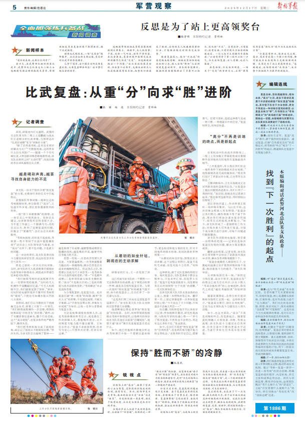 當(dāng)喝彩聲讓人沉浸于成功的喜悅時(shí),主動(dòng)按下“歸零鍵”,體現(xiàn)的是一種“勝而不驕”的冷靜。這需要突破“面子關(guān)”和“舒適區(qū)”的勇氣,其本質(zhì)是對(duì)戰(zhàn)斗力標(biāo)準(zhǔn)的執(zhí)著堅(jiān)守,是對(duì)“今天訓(xùn)練場(chǎng)上的高分,能否成為明日戰(zhàn)場(chǎng)上的勝算”這一命題的嚴(yán)肅追問(wèn)。