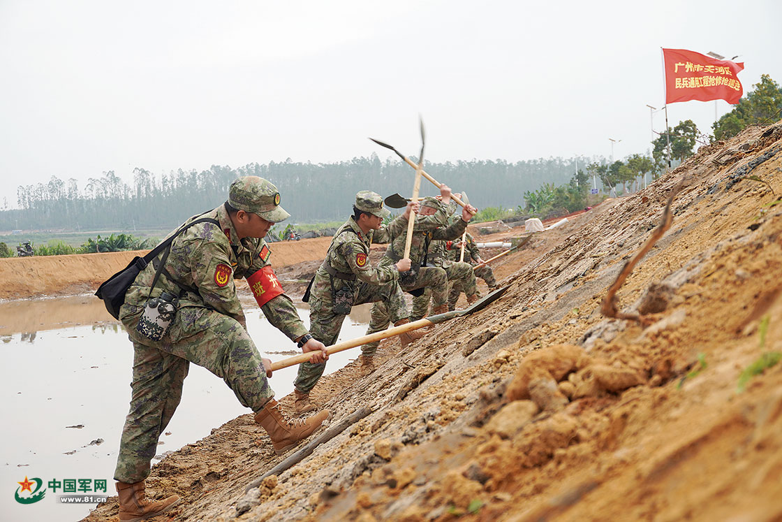 使命催征,聞令而動。廣州警備區(qū)按照專業(yè)對口、檢驗練兵原則,迅速調(diào)集荔灣、天河等6區(qū)近300名基干民兵,跨越近500公里馳援雷州半島。