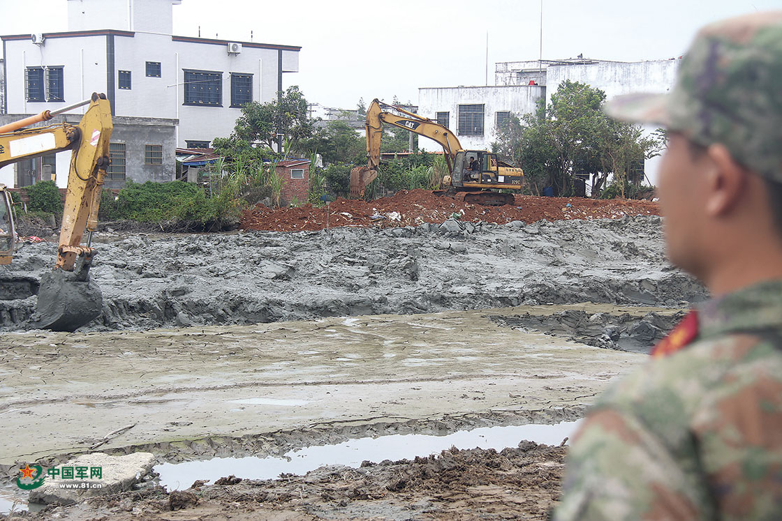民兵駕駛挖掘機清理淤泥。徐梓強攝