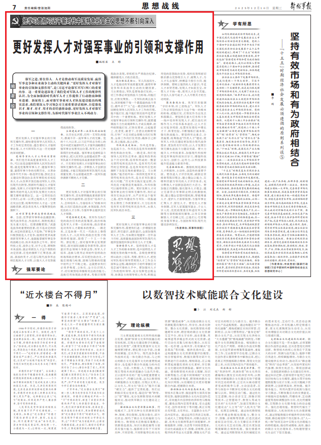 強(qiáng)軍之道,要在得人。人才是推動我軍高質(zhì)量發(fā)展、贏得軍事競爭和未來戰(zhàn)爭主動的關(guān)鍵因素?!案冒l(fā)揮人才對強(qiáng)軍事業(yè)的引領(lǐng)和支撐作用”,是《習(xí)近平論強(qiáng)軍興軍(四)》的重要內(nèi)容。這一重要論述深化了我們黨對軍隊人才工作的規(guī)律性認(rèn)識,為全面加強(qiáng)新時代我軍人才工作提供了行動指南和根本遵循。新征程上,面對強(qiáng)軍事業(yè)對人才隊伍建設(shè)提出的現(xiàn)實需求,我們要深入學(xué)習(xí)領(lǐng)會習(xí)主席重要講話精神,自覺強(qiáng)化識才、聚才、育才、用才的責(zé)任感使命感,更好發(fā)揮人才對強(qiáng)軍事業(yè)的引領(lǐng)和支撐作用,為新時代強(qiáng)軍事業(yè)注入不竭動力。