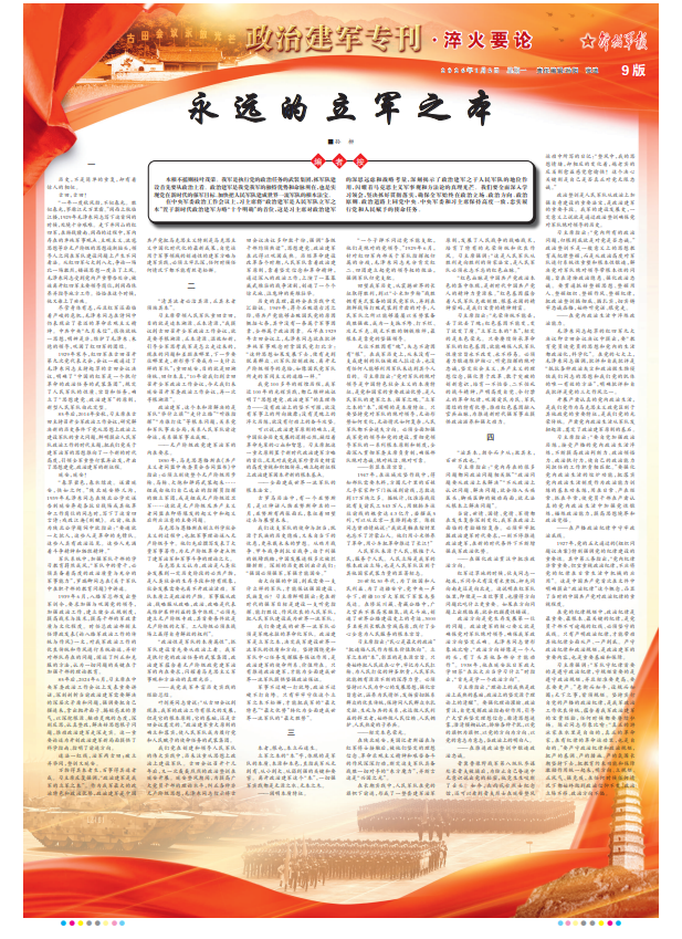 立軍之本的“本”字,體現(xiàn)的是軍隊的本質(zhì)、本源和本色,直指我軍從無到有、從小到大、從弱到強的關(guān)鍵和要害。離開政治建軍這個“本”,一切強軍實踐都是無源之水、無本之木。