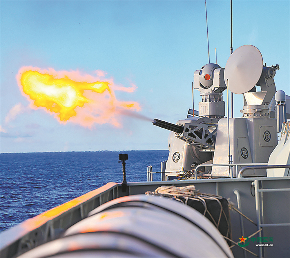 硝煙未散,對(duì)海突擊訓(xùn)練接續(xù)展開(kāi)。各艦高速機(jī)動(dòng),占領(lǐng)有利攻擊陣位。在編隊(duì)統(tǒng)一指揮下,各艦主炮對(duì)“敵”水面目標(biāo)發(fā)起火力打擊。