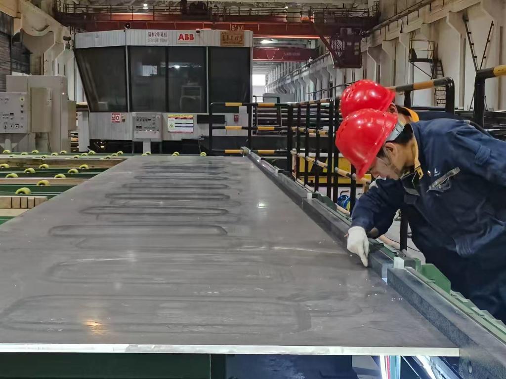 重慶西南鋁機(jī)電設(shè)備工程有限公司鋁材精深加工基地的檢測(cè)線上,技術(shù)人員在對(duì)LNG船板的直線度進(jìn)行抽檢。(受訪者供圖)
