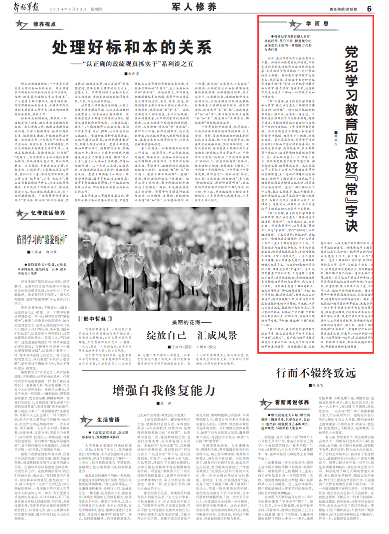 “常”之根本,在于將黨紀(jì)學(xué)習(xí)教育落在平常,使之成為黨員干部勇于擔(dān)當(dāng)作為的“壓艙石”。共產(chǎn)黨人的學(xué)習(xí)教育不是為了裝點門面,而是為了改造主觀世界和客觀世界。推進強國建設(shè)、民族復(fù)興偉業(yè),如果沒有嚴(yán)明紀(jì)律作保證,各項事業(yè)就會落空。開展黨紀(jì)學(xué)習(xí)教育,就是讓我們在知曉不能干什么的同時,也清楚能干什么,在干事上放開“手腳”。黨員干部要防止學(xué)歸學(xué)、做歸做,堅持在實學(xué)、實干、實效上下功夫。因而,每名黨員不管黨齡多長,不論職務(wù)高低,都應(yīng)牢記自己的第一身份是共產(chǎn)黨員,時刻不忘自己應(yīng)盡的義務(wù)和責(zé)任,自覺用黨規(guī)黨紀(jì)校正思想和行動,守正創(chuàng)新,銳意進取,努力創(chuàng)造無愧于黨、無愧于人民、無愧于時代的新業(yè)績。每名黨員干部都要提高政治站位、扛起政治責(zé)任,將遵規(guī)守紀(jì)與敢作善為統(tǒng)一起來,在紀(jì)律允許的范圍內(nèi)干事創(chuàng)業(yè)、大展身手,不折不扣貫徹落實黨中央各項決策部署,推動黨的路線方針政策在本地區(qū)本部門落地生根,使黨紀(jì)學(xué)習(xí)教育成為促進中心工作的有力抓手,努力做守紀(jì)律、講規(guī)矩的老實人、實干家。領(lǐng)導(dǎo)干部更要發(fā)揮“頭雁效應(yīng)”,在遵規(guī)守紀(jì)和擔(dān)當(dāng)作為上走在前、作表率,一級示范給一級看、一級帶領(lǐng)著一級干,真正讓紀(jì)律嚴(yán)起來、把規(guī)矩立起來,帶動形成建功新時代、爭創(chuàng)新業(yè)績的生動局面。