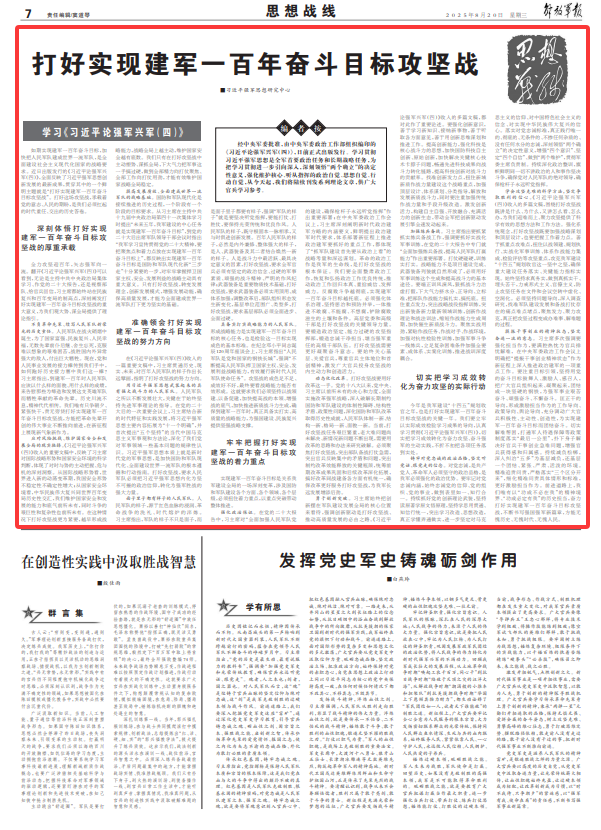 如期實(shí)現(xiàn)建軍一百年奮斗目標(biāo),加快把人民軍隊(duì)建成世界一流軍隊(duì),是全面建設(shè)社會(huì)主義現(xiàn)代化國家的戰(zhàn)略要求。近日出版發(fā)行的《習(xí)近平論強(qiáng)軍興軍(四)》,全面反映了習(xí)近平強(qiáng)軍思想創(chuàng)新發(fā)展的最新成果,貫穿其中的一個(gè)鮮明主題就是“打好實(shí)現(xiàn)建軍一百年奮斗目標(biāo)攻堅(jiān)戰(zhàn)”。打好這場(chǎng)攻堅(jiān)戰(zhàn),承載著黨的意志、人民的期盼,是我們必須扛起的時(shí)代重任、交出的歷史答卷。