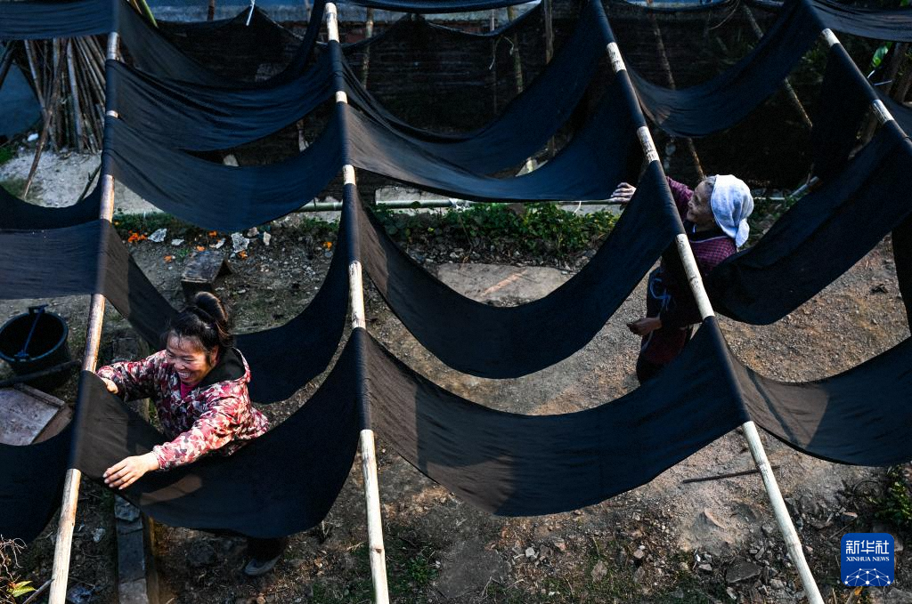 貴州省黎平縣肇興侗寨的村民在晾曬侗布(12月19日攝)。新華社記者 楊文斌 攝