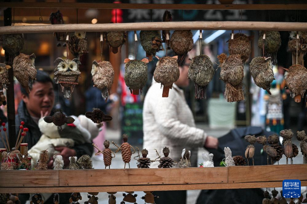 村民在貴州省黎平縣肇興侗寨售賣(mài)文創(chuàng)產(chǎn)品(12月20日攝)。新華社記者 楊文斌 攝