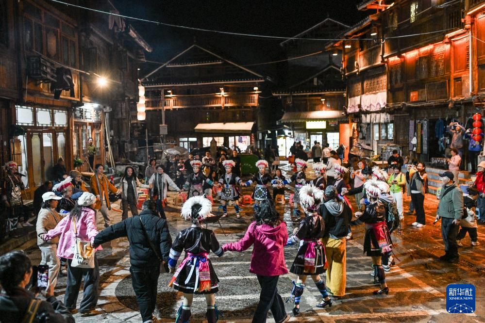 在貴州省黎平縣肇興侗寨,游客與村民在一起跳舞(12月19日攝)。新華社記者 楊文斌 攝