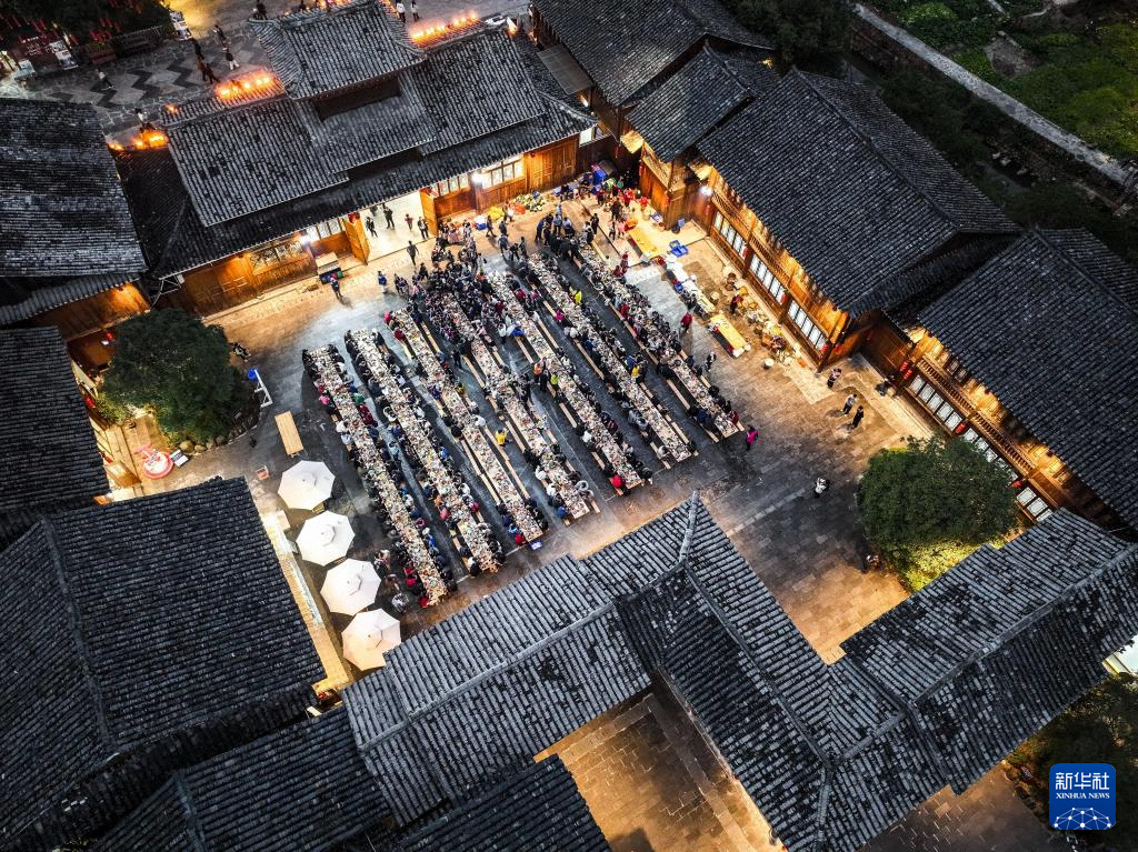 在貴州省黎平縣肇興侗寨,侗族同胞與來(lái)賓在侗年活動(dòng)中共享長(zhǎng)桌宴(12月20日攝,無(wú)人機(jī)照片)。
