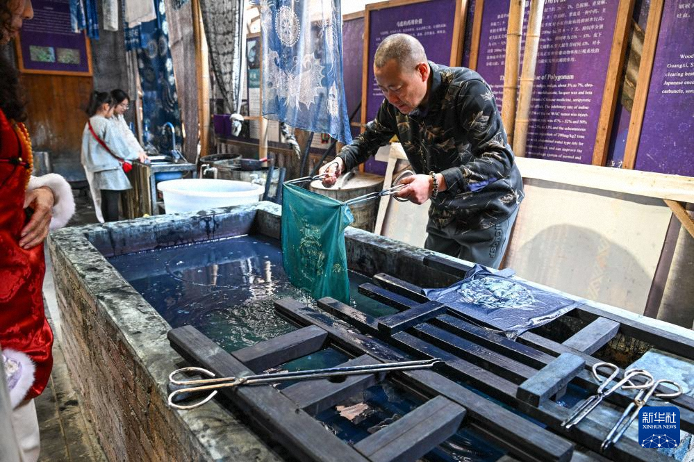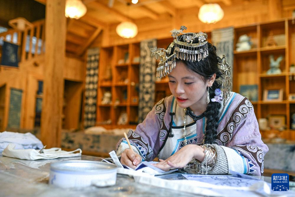 游客在貴州省黎平縣肇興侗寨侗品源傳統(tǒng)工藝農(nóng)民專業(yè)合作社里體驗(yàn)蠟染技藝(12月20日攝)。新華社記者 楊文斌 攝
