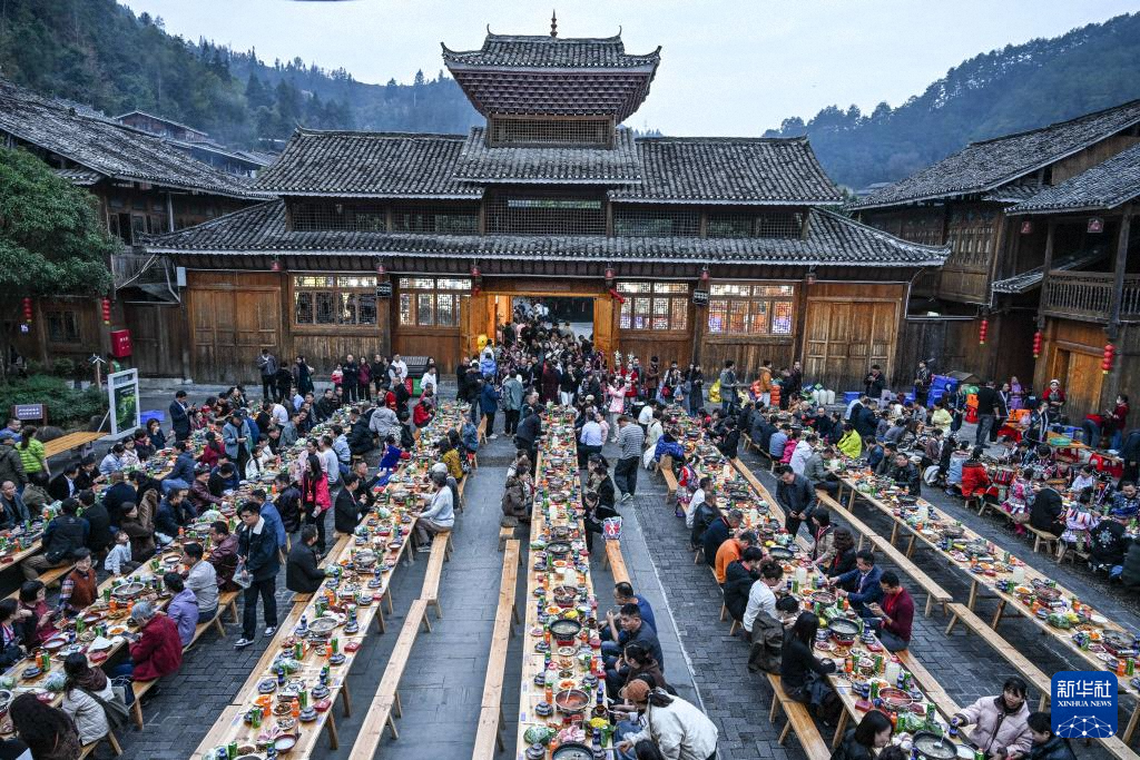 在貴州省黎平縣肇興侗寨,侗族同胞與來(lái)賓在侗年活動(dòng)中共享長(zhǎng)桌宴(12月20日攝)。新華社記者 楊文斌 攝