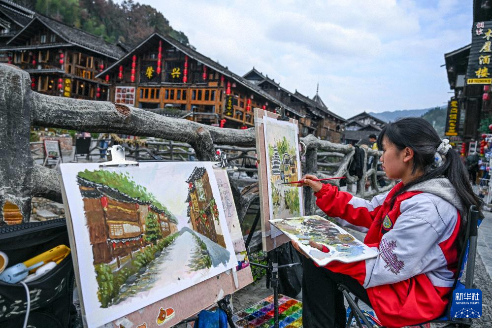 學(xué)生在貴州省黎平縣肇興侗寨寫(xiě)生(12月19日攝)。新華社記者 楊文斌 攝