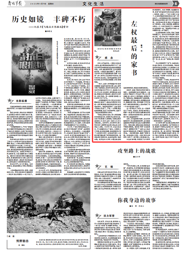 這封家書寫后的第三天,八路軍總部按計劃轉(zhuǎn)移到山西遼縣十字嶺,轉(zhuǎn)移中被日軍飛機發(fā)現(xiàn)。左權(quán)在指揮八路軍總部機關(guān)突圍的血戰(zhàn)中,為掩護戰(zhàn)友,不幸被彈片擊中,壯烈犧牲,年僅37歲。一顆將星隕落了,山河動容。