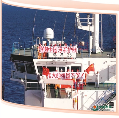 被護商船船員拉橫幅向編隊致敬。李 眺攝