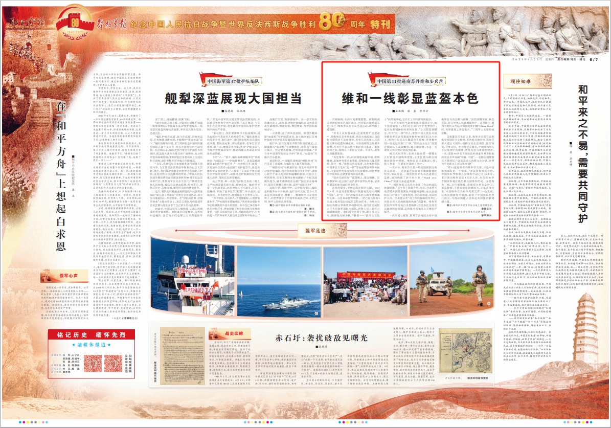 “當年先輩用生命熱血換來祖國安寧,如今祖國富強了,我們走出國門守護世界和平,是對先輩精神的傳承和發(fā)揚。”女兵任美娟感言,作為“紅一師”傳人,看到中國人民抗日戰(zhàn)爭暨世界反法西斯戰(zhàn)爭勝利80周年紀念大會上,維和方隊官兵頭戴藍色貝雷帽、步伐整齊劃一地走過天安門廣場,“狼牙山五壯士”戰(zhàn)旗在閱兵場上高高飄揚,她心潮澎湃,為這一光榮而又偉大的時刻感到自豪。