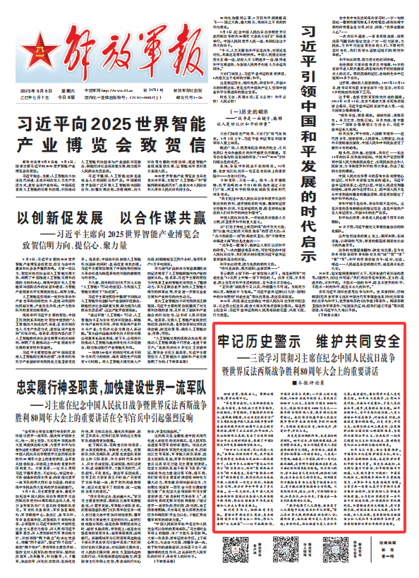 “歷史警示我們,人類命運休戚與共,各個國家、各個民族只有平等相待、和睦相處、守望相助,才能維護共同安全,消弭戰(zhàn)爭根源,不讓歷史悲劇重演!”習(xí)主席在紀(jì)念中國人民抗日戰(zhàn)爭暨世界反法西斯戰(zhàn)爭勝利80周年大會上的重要講話,闡明了正義必勝、和平必勝、人民必勝的偉大真理,發(fā)出了堅定捍衛(wèi)國際公平正義的時代強音,展現(xiàn)了中國堅持走和平發(fā)展道路的堅定決心。