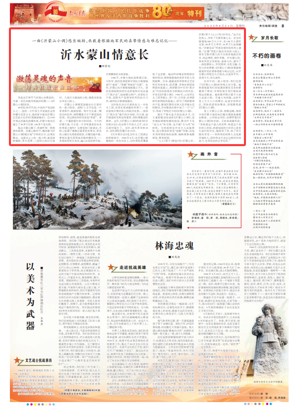 “人人(那個(gè))都說(shuō)(哎)沂蒙山好,沂蒙(那個(gè))山上(哎)好風(fēng)光?!边@片紅色熱土,孕育了無(wú)數(shù)英雄兒女。在當(dāng)時(shí)根據(jù)地420萬(wàn)人口中,有120萬(wàn)人擁軍支前,20多萬(wàn)人參軍,10多萬(wàn)人血染疆場(chǎng)?!耙拭赡赣H”用慈母情懷撫育烈士遺孤,“紅嫂”用乳汁救治負(fù)傷的小戰(zhàn)士,更有無(wú)數(shù)沂蒙人民不分晝夜地救治傷員、抬運(yùn)彈藥、制作軍糧。沂水蒙山間,革命軍民生死相依、患難與共,譜寫(xiě)了一曲黨群同心、軍民情深、水乳交融、生死與共的贊歌。《沂蒙山小調(diào)》承載著根據(jù)地軍民的真摯情感與難忘記憶,從沂水蒙山傳唱至大江南北;從戰(zhàn)爭(zhēng)年代一直到今天,經(jīng)久流傳。