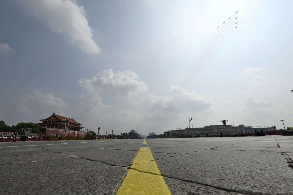 9月3日,紀念中國人民抗日戰(zhàn)爭暨世界反法西斯戰(zhàn)爭勝利80周年大會在北京隆重舉行。這是教練機梯隊飛過天安門廣場上空。