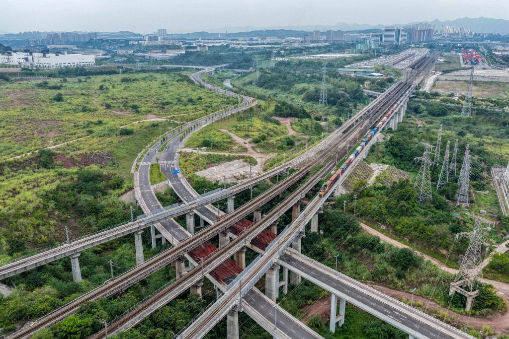 9月28日,西部陸海新通道班列在重慶魚嘴站順利發(fā)車(無人機照片)。新華社記者 唐奕 攝