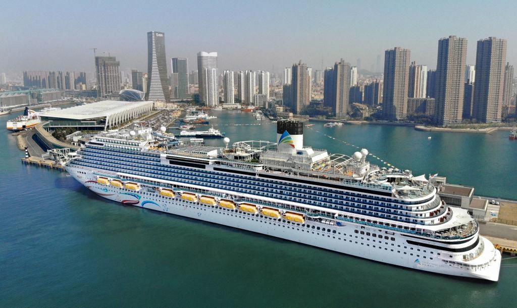“愛達·魔都號”郵輪靠泊在青島郵輪母港碼頭(4月6日攝,無人機照片)。新華社記者 李紫恒 攝