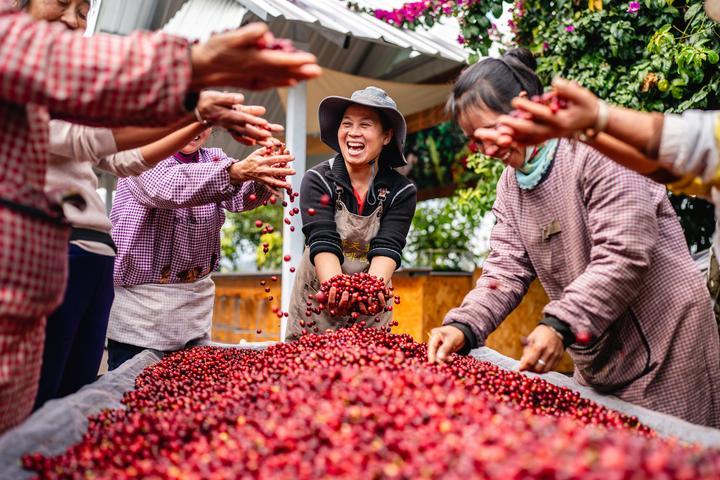 2025年1月8日,在云南省普洱市思茅區(qū)天玉咖啡莊園,工作人員慶祝今年咖啡豐收。目前,普洱市咖啡種植面積達(dá)67.9萬(wàn)畝,2023到2024年產(chǎn)季咖啡生豆產(chǎn)量5.8萬(wàn)噸,穩(wěn)居中國(guó)咖啡種植面積與產(chǎn)量之首。