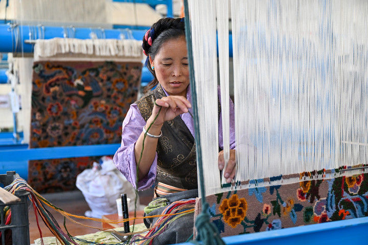 2025年7月18日,江孜藏毯文化發(fā)展有限責(zé)任公司的員工在生產(chǎn)車間內(nèi)編織藏毯。西藏日喀則市江孜縣是著名的藏毯(藏族稱為“卡墊”)之鄉(xiāng),織毯歷史悠久。藏族卡墊織造技藝于2006年被列入國(guó)家級(jí)非物質(zhì)文化遺產(chǎn)代表性項(xiàng)目名錄。近年來(lái),江孜藏毯在守護(hù)傳統(tǒng)技藝的同時(shí)積極創(chuàng)新,通過(guò)建立合作社、開辦技能培訓(xùn)班等方式擴(kuò)大靈活就業(yè)規(guī)模,讓更多人在家門口織藏毯增收。